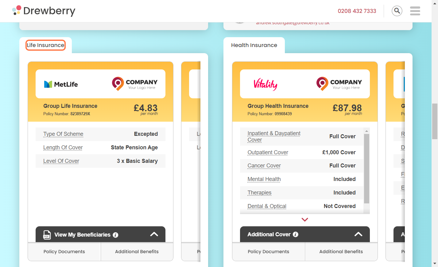 On your My.Drewberry dashboard, you’ll have a number of “cards” which host the different benefits and insurance types (such as Life Insurance, Income Protection, or Critical Illness Cover).