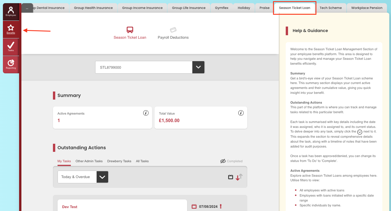 When an employee signs up for the Season Ticket Loan Scheme, you will receive an approval task within the admin centre of My.Drewberry. To view this task, navigate to the ‘Benefits’ tab, then the ‘Season Ticket Loan’ tab.
