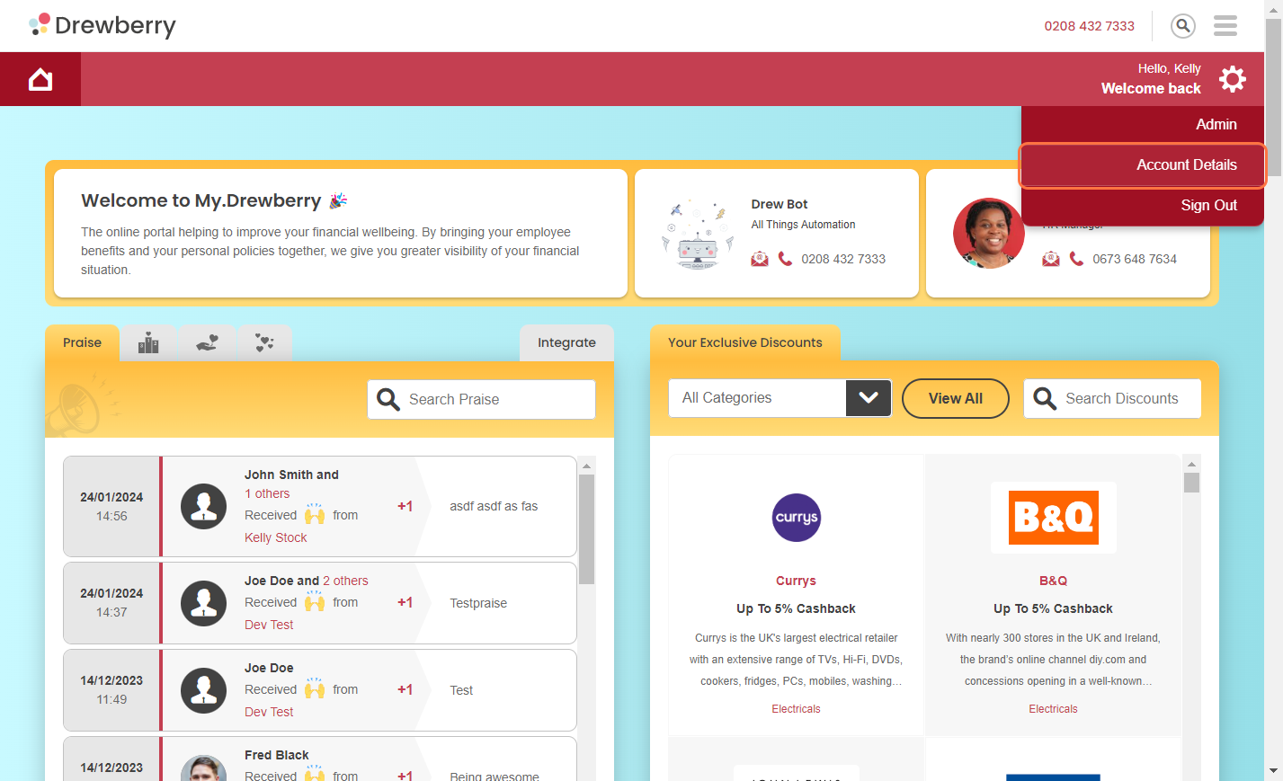 Click the Settings cog in the top right hand corner of your My.Drewberry dashboard and select “Account Details”.
