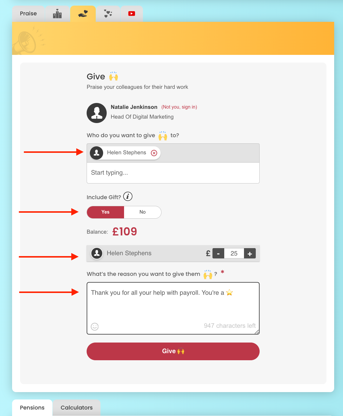 Once an employee has been allocated funds, they can begin attaching monetary rewards to the praise they give colleagues. While the process of giving praise remains the same, they will now have the option to include a gift alongside it.