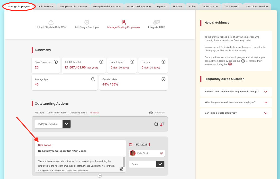 If when uploading employees via bulk CSV or via your HRIS, you forget to add an employee category to their record, an automatic task will be generated within the ‘Manage Employees’ tab prompting you to add it. This task will show under theΒ ‘Outstanding Actions’ section.