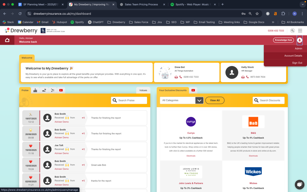 To update an employee’s PMI excess cover, head to the Health Cash Plan tab in your Admin Centre. Click the ‘Avatar’ icon in the top-right corner of your dashboard, then select ‘Admin‘ from the menu.