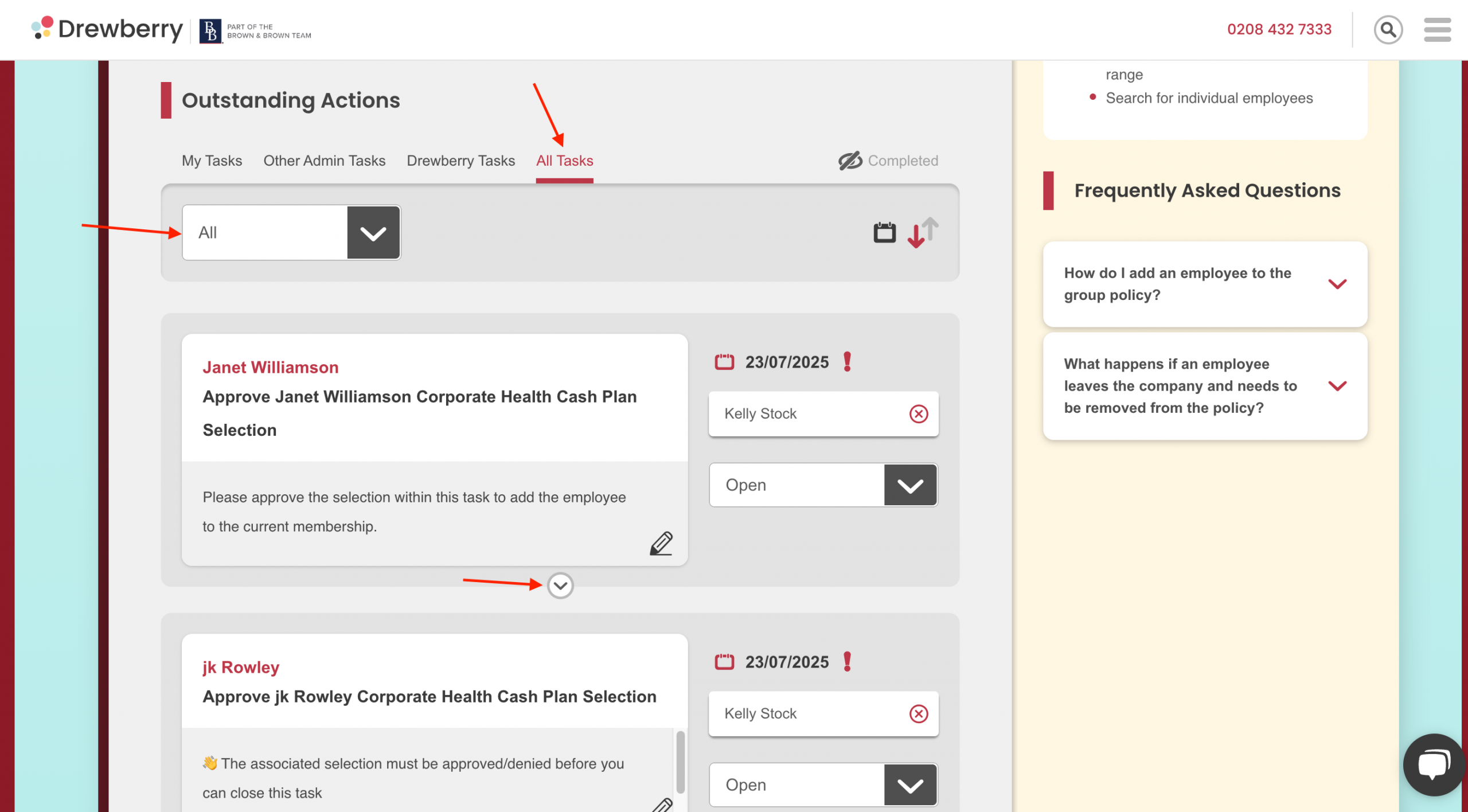 If a new employee, who is eligible for the Health Cash Plan, has been added to the platform, you’ll see a selection approval task under ‘Outstanding Actions’. Make sure that you are looking at ‘All Tasks’ and the drop down is selected to ‘All’