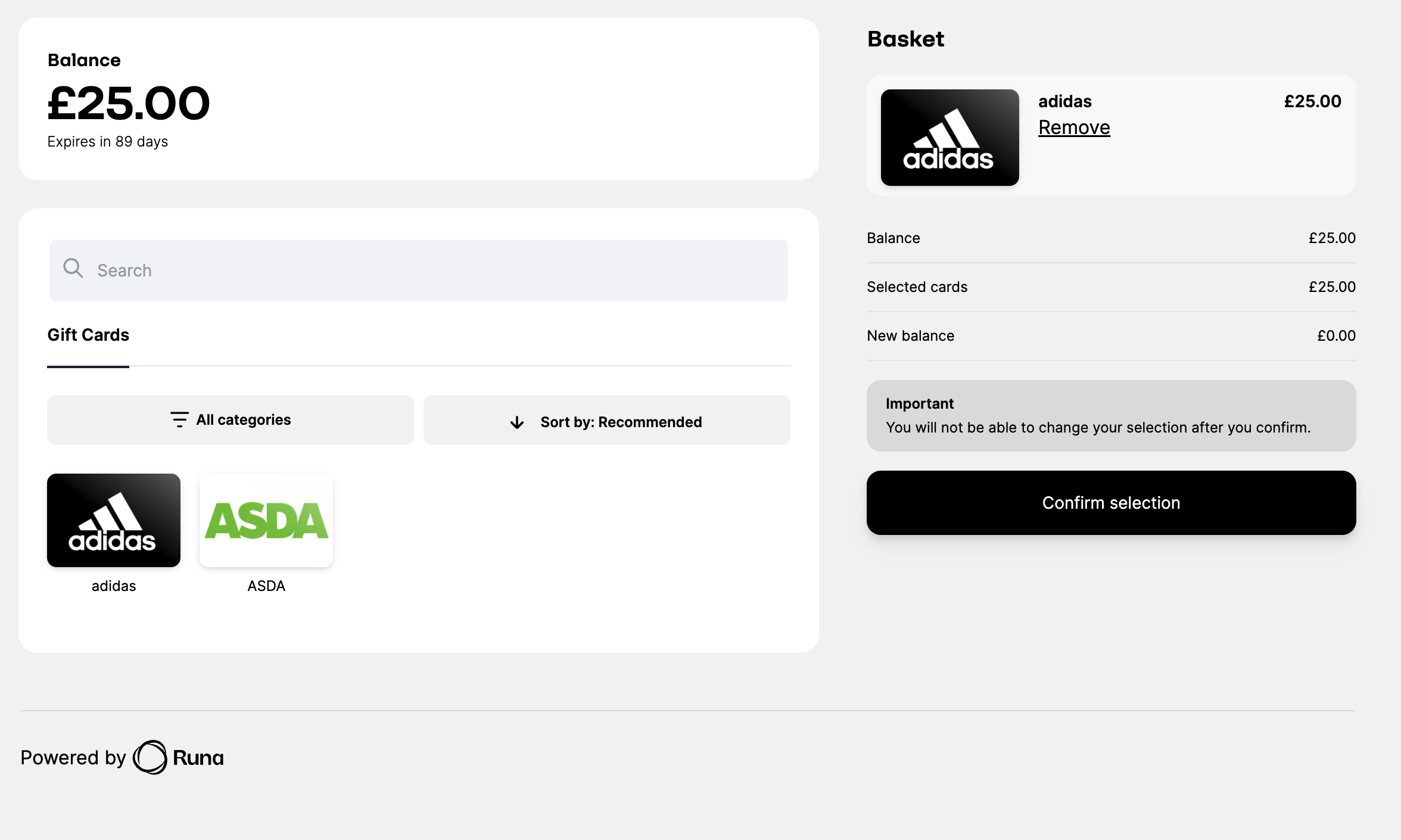 Clicking the link will take them to Runa, where they can browse a selection of participating retailers - Choose a Gift Card