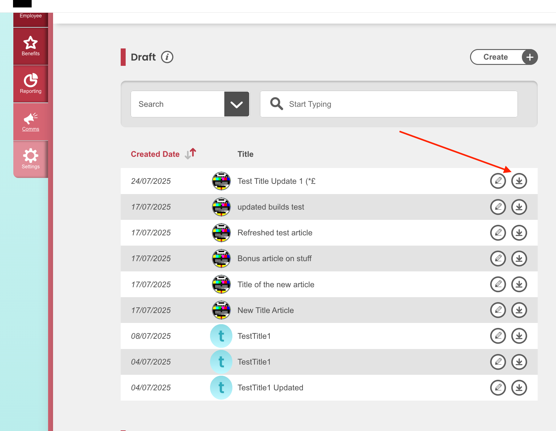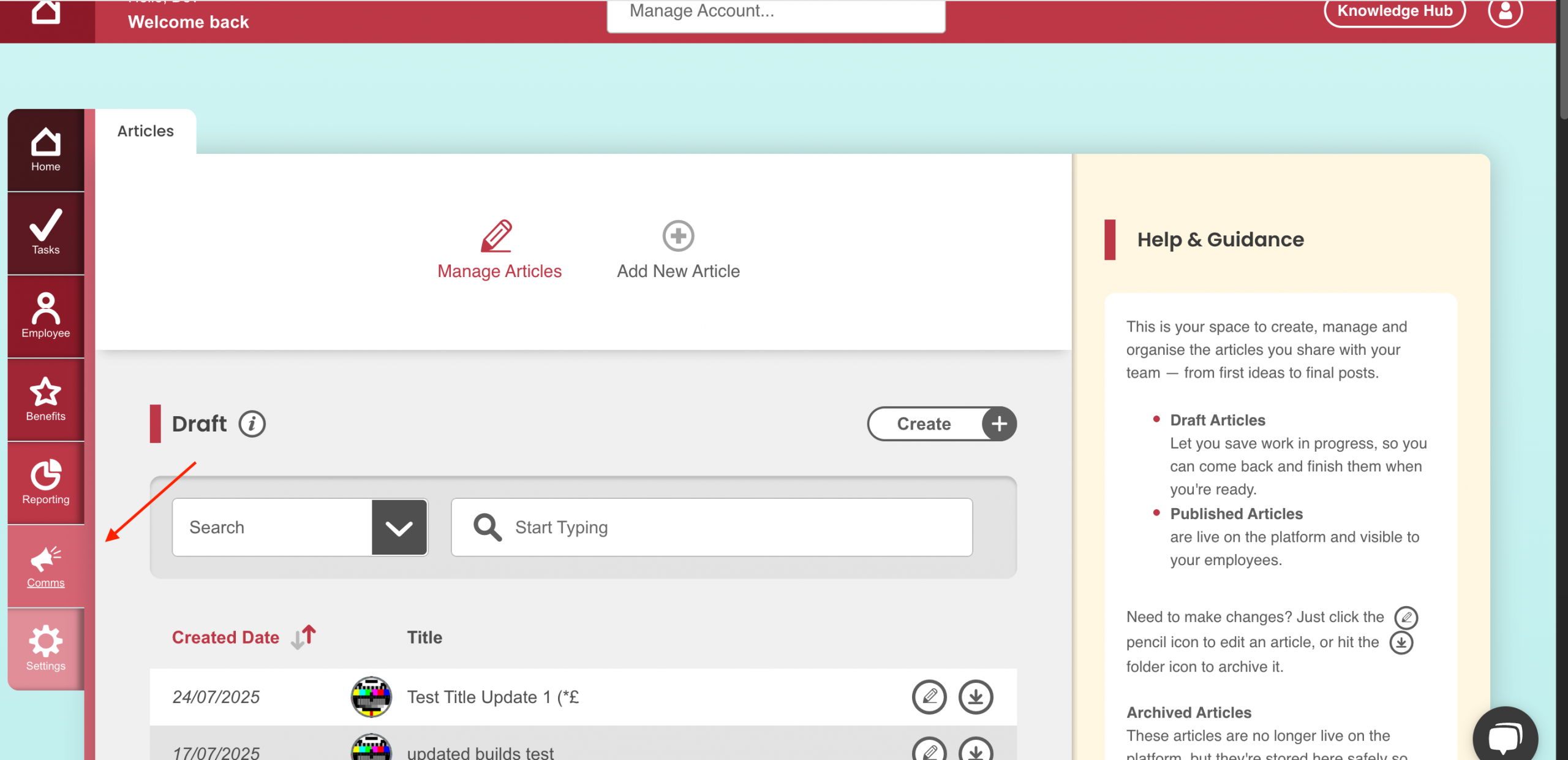 When you open the Comms tab, you’ll land on the Managing Articles page. This is your central hub for overseeing all your internal communications. From here, you can view and manage every article you’ve created, including: