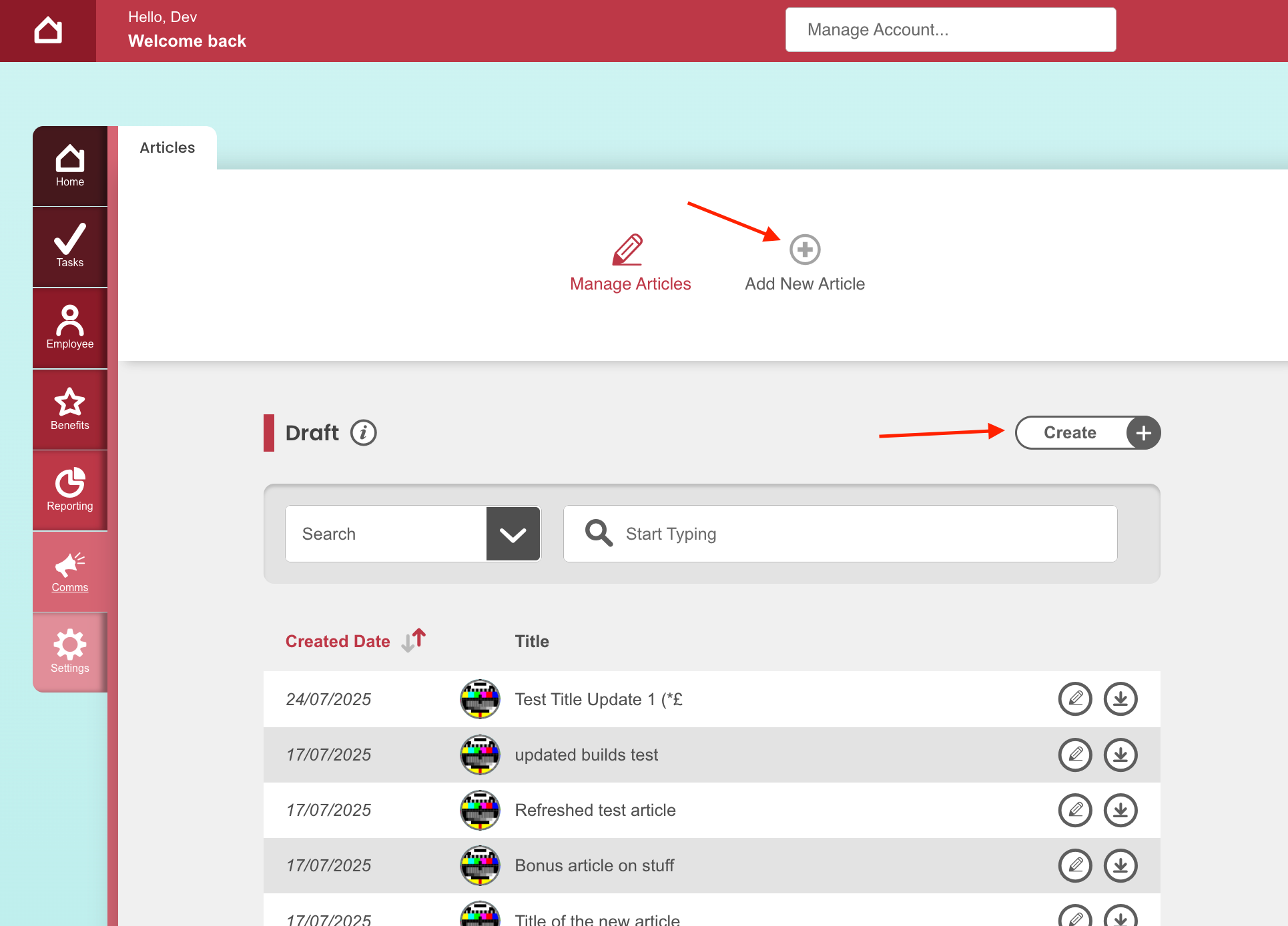 To start a new article, simply click the ‘Create’ button at the top right of the screen or the ‘Add New Article’ icon at the top of the page.