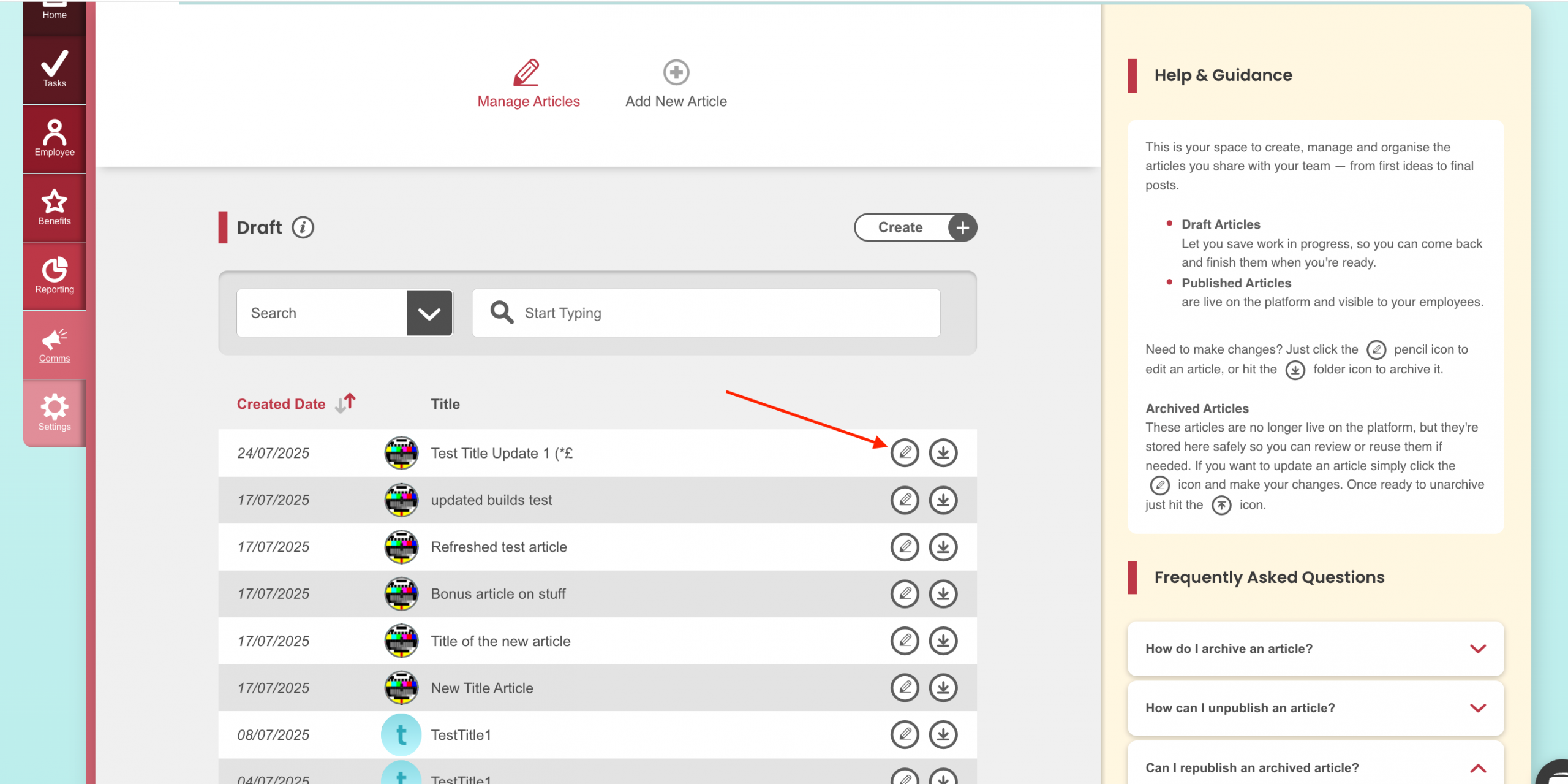 If you want to remove a draft without opening it, you can archive it directly from the Manage Articles homepage. Just click the down arrow icon next to the pencil. The article will be moved into the Archived section, where it can still be accessed, updated, or republished in the future, it just won’t be visible to employees on the platform.