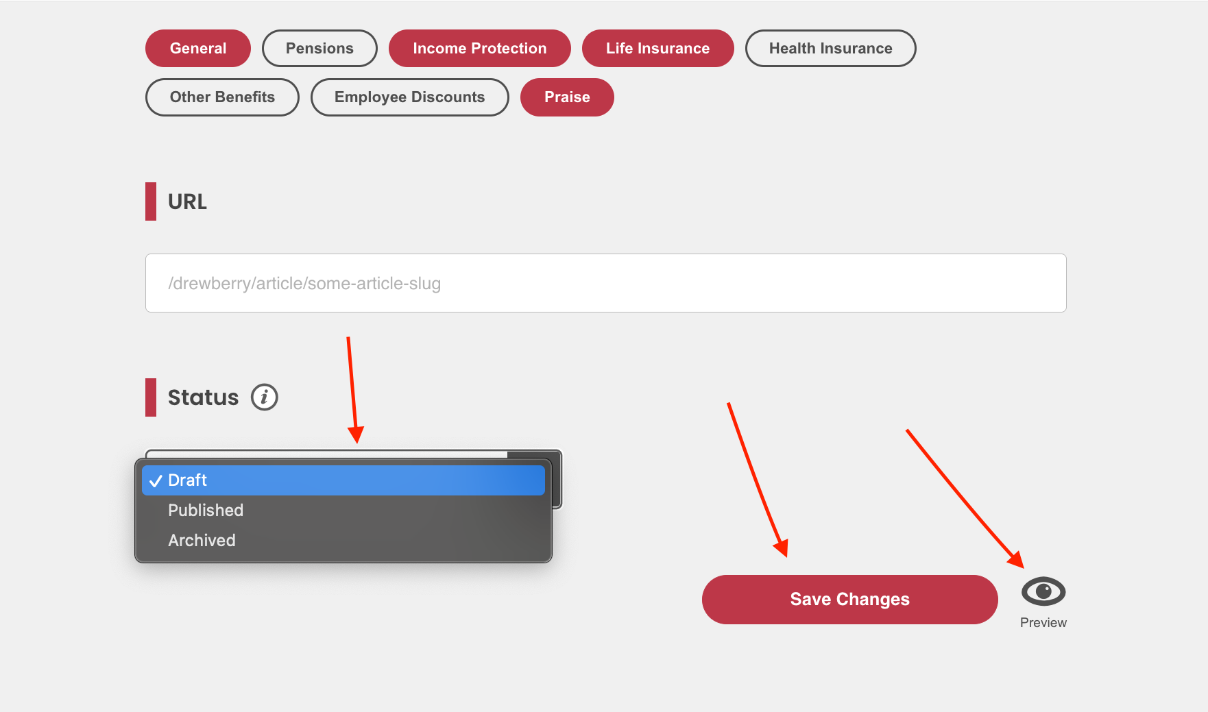 Once you’ve finished updating your content, scroll to the bottom of the editor, you can save your progress to return later, or update the article status to ‘Published’ to set it live on the platform, or switch it to ‘Archived’ if it’s no longer needed.