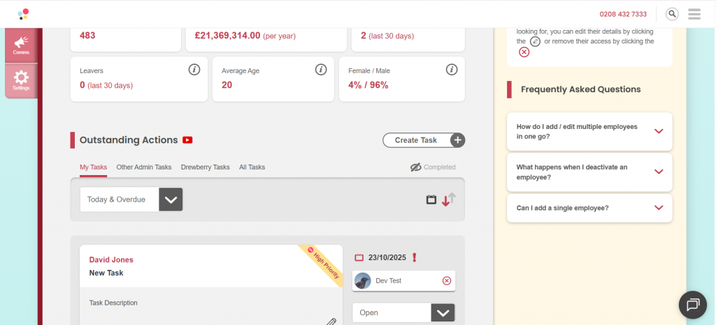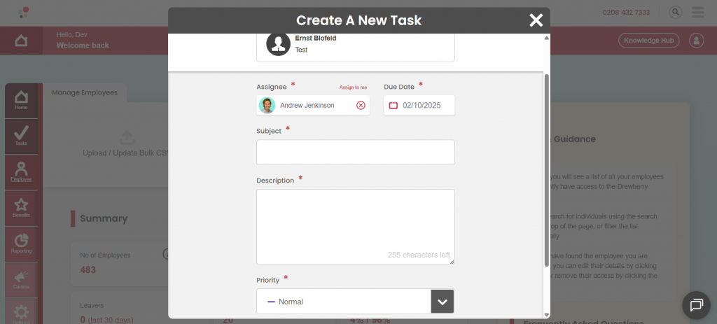 Tasks can be created directly from key areas of the platform, starting with the Employee tab.