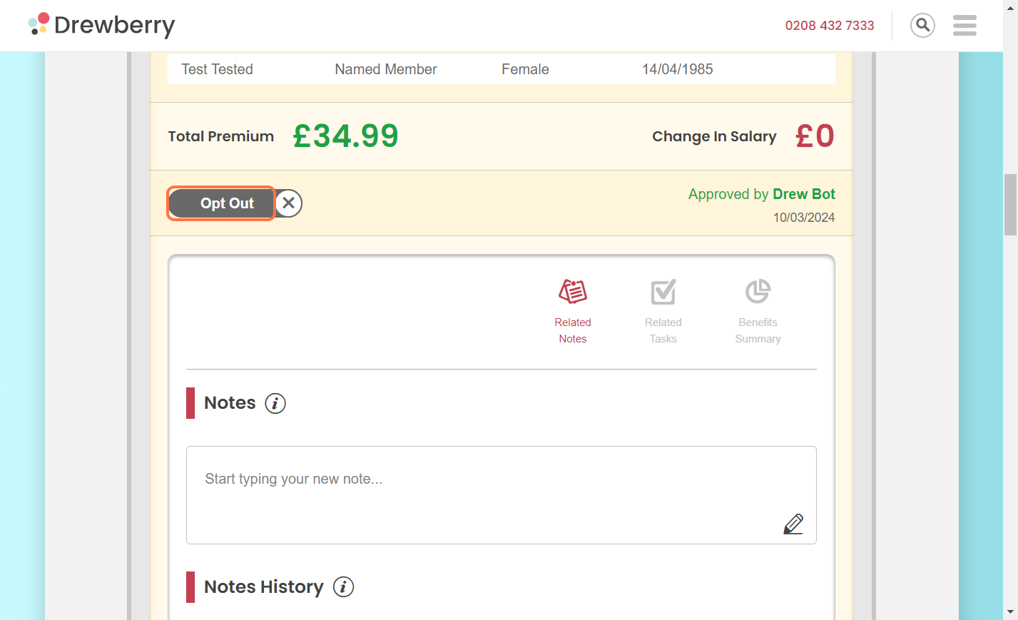 By clicking the “Down Arrow” on the relevant task, you can expand it to get further information. You will see that the level of cover under the Employee Selection line reads Opted Out. You then have the option to approve or deny the request using the red and green buttons below this.