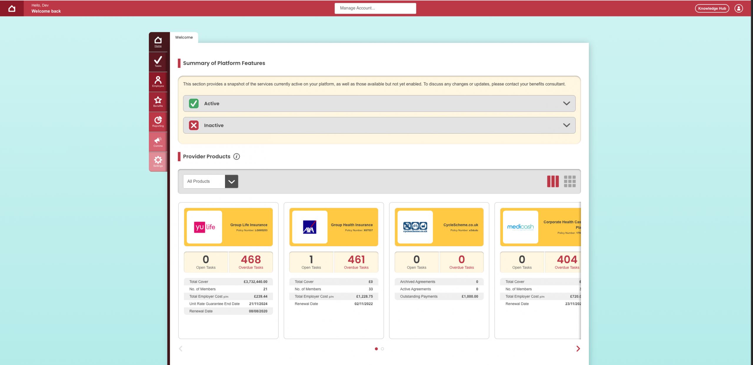 The Platform Overview tab brings your entire benefits setup into focus. From live features and active schemes to what’s available to switch on, everything is laid out clearly in one easy-to-navigate space.