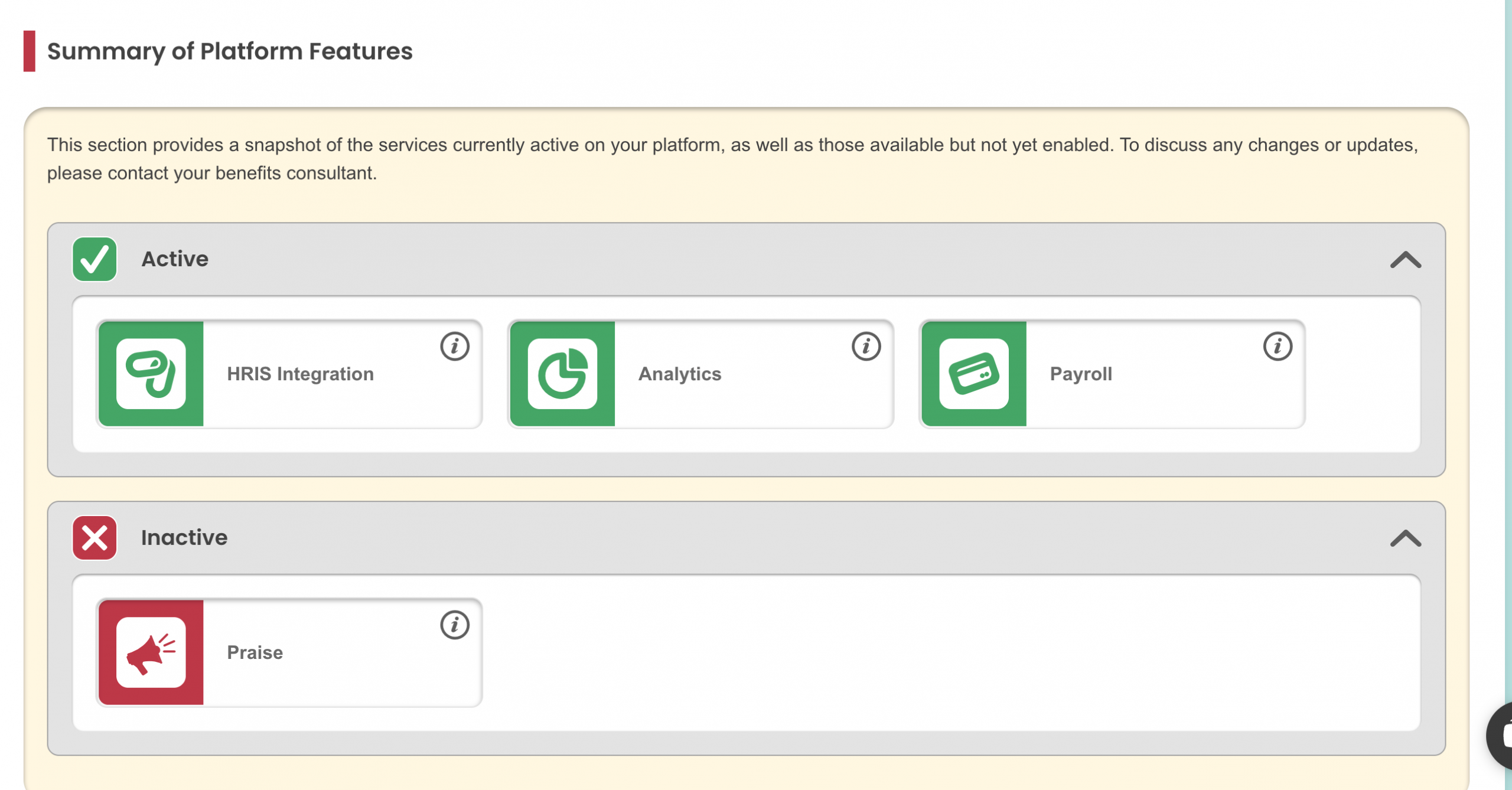 To activate any ‘Inactive’ features, simply reach out to your benefits consultant, they’ll help you get things up and running.